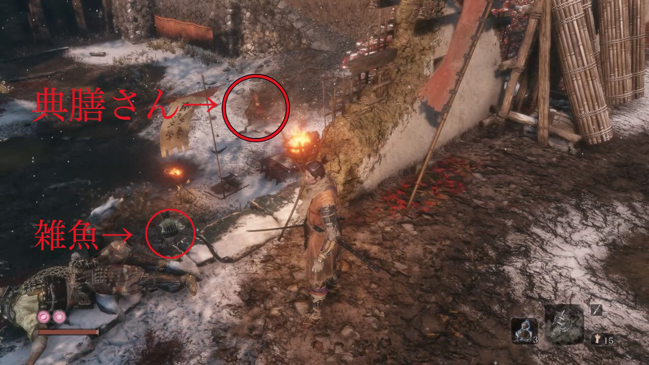 赤鬼を撃破して先へ進むとすぐに典膳さんと出会えます、しかし突っ込んで行くと死にます